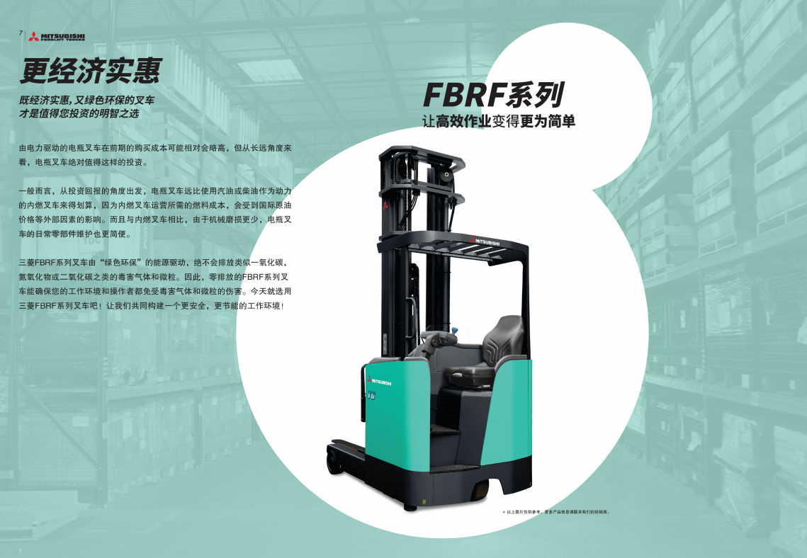 三菱叉車 FBRF系列前移式叉車 經(jīng)濟(jì)實惠既經(jīng)濟(jì)實惠,又綠色環(huán)保的叉車 才是值得您投資的明智之選由電力驅(qū)動的電瓶叉車在前期的購買成本可能相對會略高,但從長遠(yuǎn)角度來看,電瓶叉車絕對值得這樣的投資。一般而言,從投資回報的角度出發(fā),電瓶叉車遠(yuǎn)比使用汽油或...