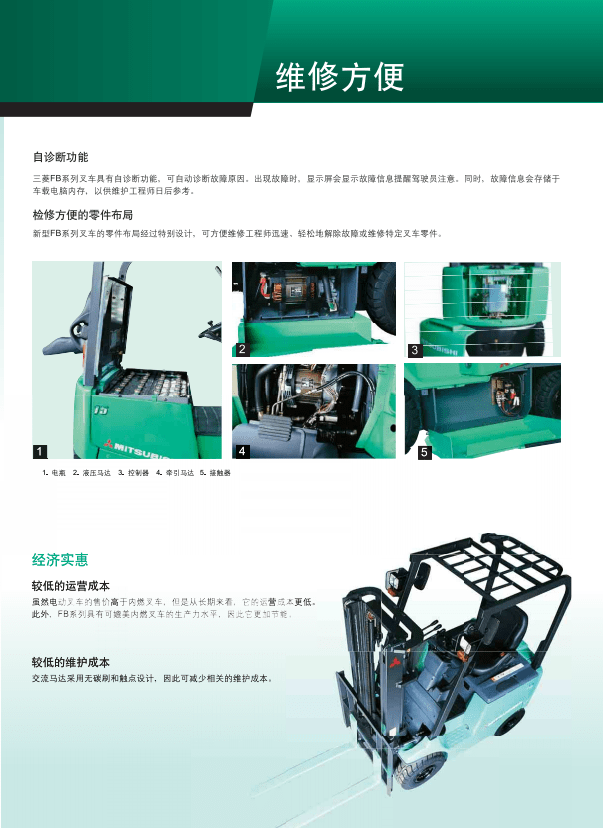 維修方便自診斷功能三菱FB系列叉車具有自診斷功能,可自動診斷故障原因。出現(xiàn)故障時,顯示屏會顯示故障信息提醒駕駛員注意。同時,故障信息會存儲于車載電腦內(nèi)存,以供維護工程師日后參考。檢修方便的零件布局新型FB系列叉車的零件布局經(jīng)過特別設(shè)計,可方便維...