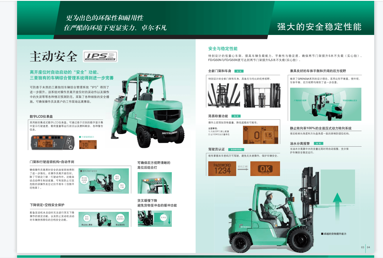 主動(dòng)安全可防患于未然的三菱獨(dú)創(chuàng)車輛綜合管理系統(tǒng)-IPS-得到了 進(jìn)一步提升。該系統(tǒng)對(duì)操作員離開(kāi)座位時(shí)的誤動(dòng)作以及操作 中的失誤等等各種情況預(yù)測(cè)防范,采取了各種細(xì)致的安全措 施,可確保操作員及客戶的工作現(xiàn)場(chǎng)遠(yuǎn)離事故。數(shù)字LCDft表盤釆用新的集成式數(shù)字LCD...